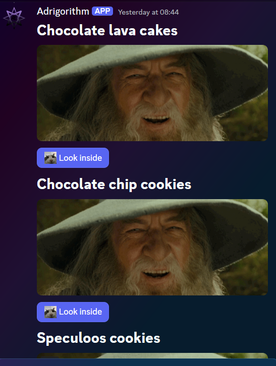 This ComponentBuilderV2 is used to create a message with a text field, an image and a button. Take note on the customId property of the Button: $"{RecipesLookInsideButton}-{recipe.RecipeId}", it is always important to ensure it is unique within a message, so we can respond to the user interacting with it. More on that later.