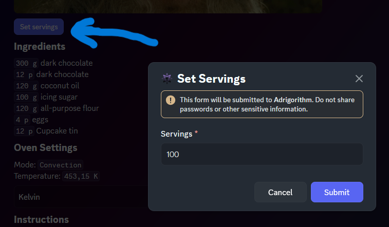 After the SET SERVINGS modal is submitted (or the COMBOXBOX is changed) the UI is updated: